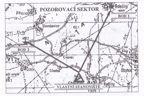 provede zákres vlastního stanoviště, pozorovacího sektoru a orientačních bodů, které se číslují zprava doleva a od bližšího pásma ke vzdálenému ve tvaru,